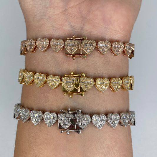 10K 9MM Heart Diamond Baguette Bracelet 7.5"