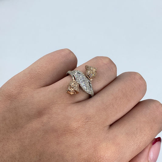14K Two-Tone Flower Diamond Baguette Bangle Ring